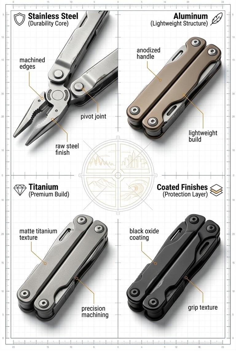 Stainless steel is the tried-and-true foundation because it mixes strength, corrosion resistance, and reasonable weight. Some multitools feature a combination of stainless steel with anodized aluminum or other composites on the handles to reduce weight or improve grip texture.